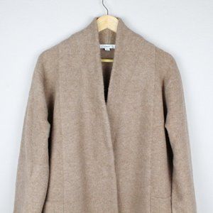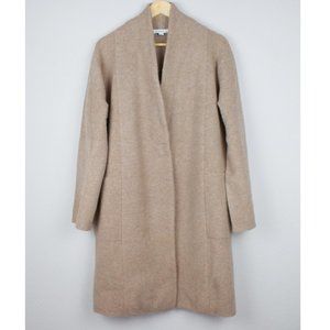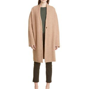 Move stylishly from desk to dinner in this woolly drapey coat styled with a single-button closure in a sweeping, longline fi t.