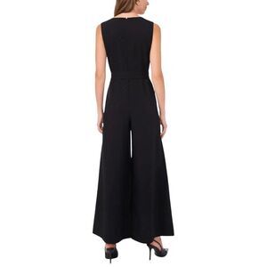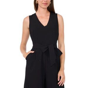 Step out in confident and chic style in the Vince Camuto® V-Neck Wide Leg Jumpsuit. Featuring a V-neckline, sleeveless design, side seam hand pockets, and a removable sash. Black appliqué rhinestones throughout give this jumpsuit an extra sparkle!