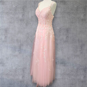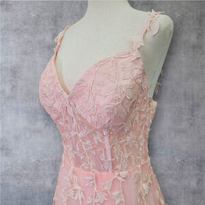 Lovely dress, perfect for any special occasion-- floral accents on the bodice, skirt, and straps. Classic sweetheart neckline, offset thigh slit, semi-sheer bodice. Has back closure that is half zip, half short corset. See photos for size chart. Spaghetti straps and full length skirt.