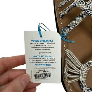 Vines Harmony Freestyle Sandal Black White Tan. Feel the rush of summertime freedom in the Harmony Freestyle from Vines. These women’s sandals are made of polyester braiding with a vines charm, memory foam heel pad & vegan-friendly construction. One of the most noticeable things about a pair of Vines sandals? THEIR SMELL – the outsole is made from recycled tire rubber infused with COCONUT ESSENTIAL OILS! It doesn’t get more tropical than that.