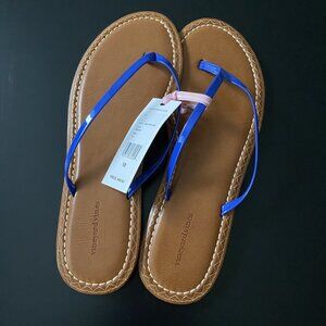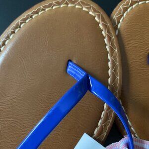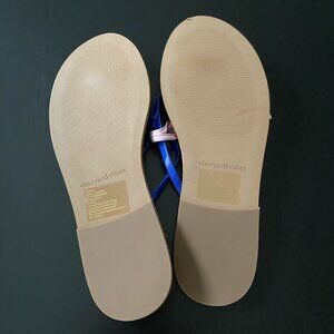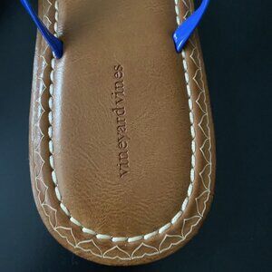 Vineyard Vines skinny strap flip flops in marlin blue. Faux leather footbed. Simple but also dressy! These are NWT but I bought them from a department store online and it looks like the soles have some wear from being tried on and a small nick (pictured). The heels don't show any wear.