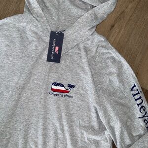 Vineyard Vines Gray Hoodie Tee, men’s size XL. This could also fit a women’s Large. American Flag Whale on the front and back. Brand new with tags! Never worn.