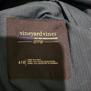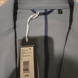 Vineyard Vines On the Go Seersucker blazer jacket. This is brand new with tags and in the Mirage Blue color. It is a size 41R. Armpit to armpit measures 22 inches and shoulder to hem is 31 inches.