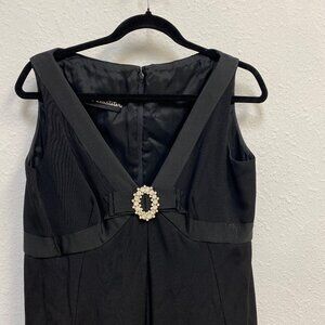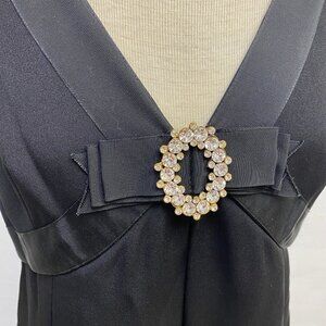 Rare NWT Vintage Gino Charles black cocktail dress in pristine condition. This v-neck, sleeveless, empire waist dress dates from the 1960s. It has a beautiful rhinestone pin in the middle of the bow detail at the bust line. The craftsmanship of this dress is impeccable.