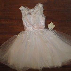 New with tags. This dress has been so popular and I just found one more. This dress is approx. 6/8 but was custom ordered so GO BY MEASUREMENTS in picture. A very light ivory color (not white) - but just off white. This was a sample for a bridal show-- custom Actual dress shipping is in the 3rd pic. All sales final-- no returns. Super popular faltering dress. has been moved around so maybe some light surface dust -maybe around the hem-- if any-- but the dress shipping is in pic 3 & 8- There are supports in the bust so you shouldn't need a bra. Very popular. Please see measurements / pictures as cross listing platforms don’t allow specific information. Also, condition status should be determined by pictures not all platforms allow for the exact category for all listings. Ask questions as there are no returns. Thanks!