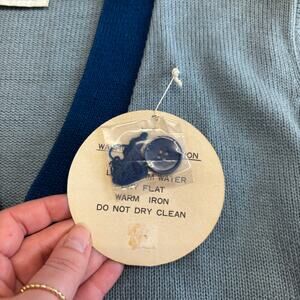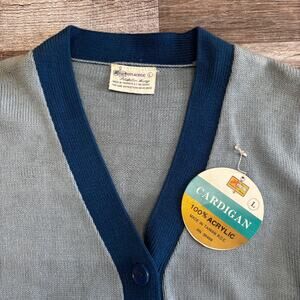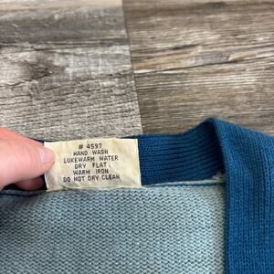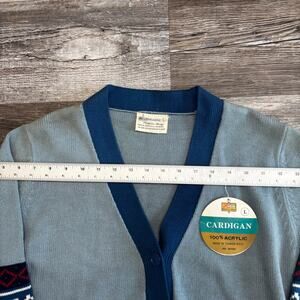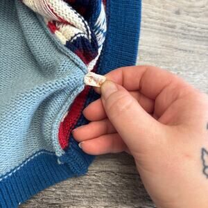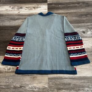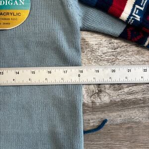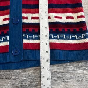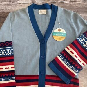 Deadstock New with tags, but note very- faint stain/fading present along shoulders, dark trim on edges contrasting striped and geometric aztec style pattern knitted, acrylic fabric, long loose sleeve button front closure, lightweight, made in Taiwan ROC. 100% Acrylic funky preppy granny hippie retro.