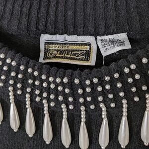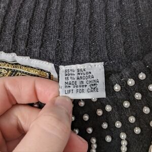 Silk, Nylon, Angora, Angora Wool, Sweater, Warm, Cozy, Pretty, Embellished, Beaded, Beads, Embellishment, Embellishments, Pearly Beads, Faux Pearls, Black, Knit, Knitwear, Crewneck, Vintage, Retro, 1980s, 80s, Angora Rabbit Fur, Fur, Long Sleeve, NWT, New With Tags, New, Beautiful, Unique, Rare, Glitz, Anytime Glitz, Glam, Glamorous, Luxe, Luxury, Fun, Halloween, Party, Costume, Event, Festival, Western Vibes, Concert, Fall, Autumn, Winter, Rare, Autumnal, Crew, Pullover Glitz and Glam, Fancy, Formal, Funky, Silk Blend, Wool Blend, Angora Blend, Shoulder Pads, Shoulder Padding, Padded Shoulder Sweater, Flattering, Pearlized Beads, Beads, Beading, Beaded Neckline, Embellished Neckline, Ribbed Neck