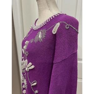 Vintage 80s Victoria Harbour Purple Sweater | White Beads in a Holiday Design | Size Medium | Ramie and Cotton | Tunic Sweater | Hong Kong