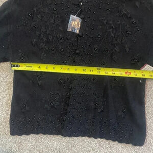 New with tags vintage 90s black embroidered cardigan. This knit features a hand-embroidered floral bead motif and scalloped edges. This sweater would be an elegant addition to a dark academia, grannycore inspired wardrobe.