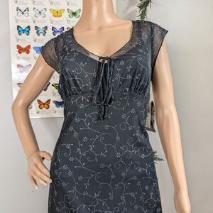 New with tags vintage late 1990s, early 2000s (y2k) Rampage midi dress. Black floral mesh overlay with slip dress underneath. Short semi-sheer flutter sleeves. Tie at bust. Milkmaid/prairie look. Ruffle at hem. Sold at Nordstrom. Perfect dark fairycore/siren look. Whimsigoth. Dress is new with tags but has some glitter fallout due to age.