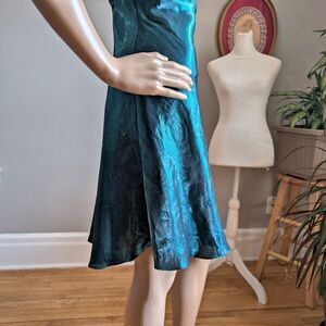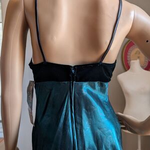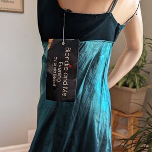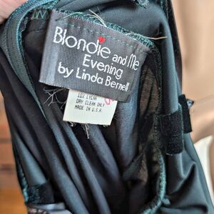 New with tags vintage 1990s Blondie and Me by Linda Bernell green mini dress. Velvet upper and floral satin embossed skirt. Zip up back. Unlined. Dress is new with tags and has no flaws.