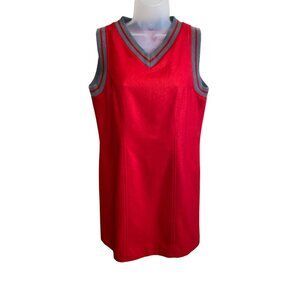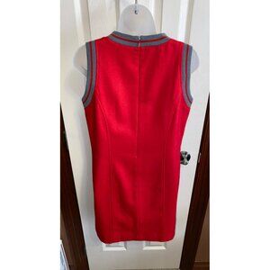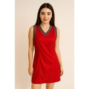 A vibrant red mini dress with a sporty V-neckline and contrast gray trim. This sleek wool blend design offers a flattering fit and timeless style.