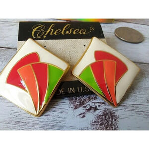 NWT Vintage Art Deco Orange Red Off-White 1980s Enamel Earrings