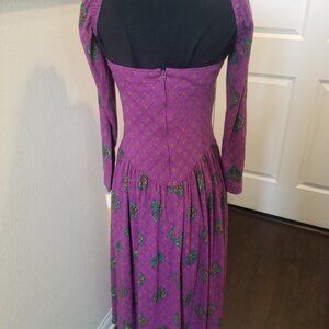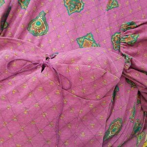What a beautiful and rare vintage dress I have for you. Purple , floral paisley-like designs, quilt-like pattern. Two types of pattern on dress.