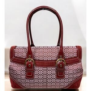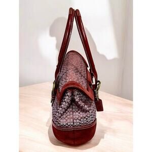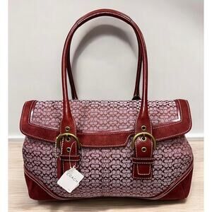 This New With Tags Vintage Coach 7080 Soho Mini Signature Flap Satchel and Wristlet from 2004 is a great set! Featuring mini Signature Jacquard in the Dark Plum colorway with brass hardware, the bag is new with tags and the wristlet is lightly used. Rare to find a new with tags bag from 2004 and if you love and appreciate vintage, Y2K coach design and quality, this is a must have for your collection!