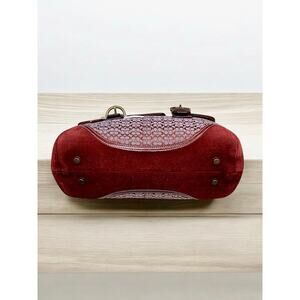 Exterior Detail – Signature Jacquard, suede trim, leather double handles, brass hardware, protective feet and front flap snap closure. Wristlet – Zip closure and wrist strap.