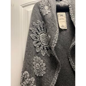 The sweater features a draped open front and is decorated with large, textured flower designs throughout. The flowers appear to be crocheted or knitted into the wool material, giving the garment a distinctive and handmade aesthetic.