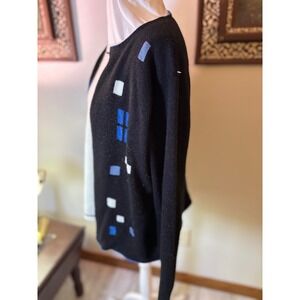 Keywords: Cricket Lane Collection, Cardigan, Open Front, Black Cardigan, Blue Cardigan, Geometric Pattern, Womens Cardigan, Size Large, Sparkle, Shimmer, Contemporary Fashion, Layering Piece, Modern Design