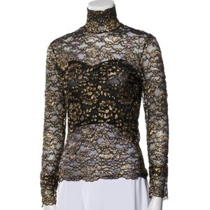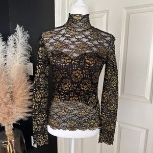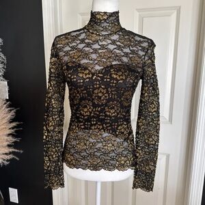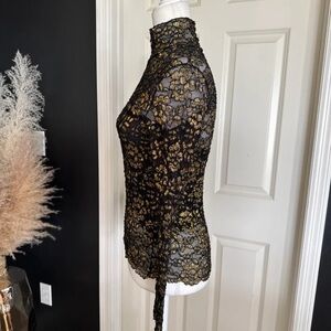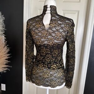 Gorgeous black long-sleeved top with gold lace detailing, featuring a mock turtleneck with back button closure.