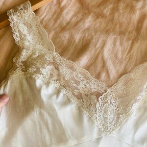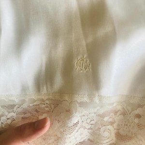 Vintage Christian Dior ivory lace-trimmed chemise with floral embroidery. This chemise would be gorgeous for a bridal boudoir session or for simply feeling extra feminine and glamorous at home. Based on my research, this piece seems to be from either 80s or 90s. It has a C Dior insignia embroidered near the hem and the prettiest tulips embroidered at the center of the bust.