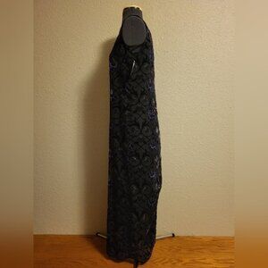Vintage Dressing Clio Black & Purple Sheer Velvet Dress Size Small with knit lining, center back vent