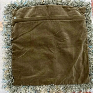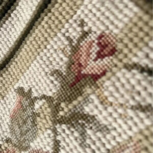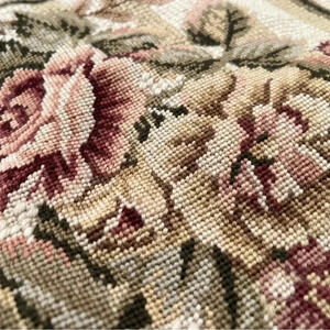 The quality of the materials, workmanship, and design are outstanding on this piece. From the wool hand-sewn needlepoint to the gorgeous vintage trim and beautiful cotton velvet back, it is simply beautiful! The color palette includes greens, cream, tan, blush pink, and just an accent of burgundy.