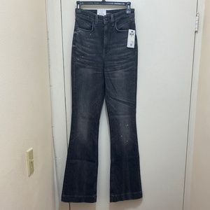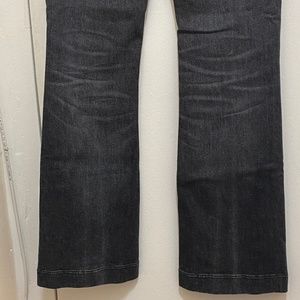 Rise: approx. 12"; skinny fit through hips and thighs; flared leg