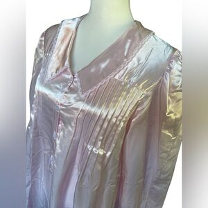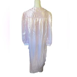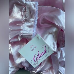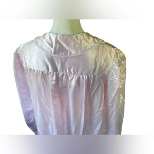 Pretty vintage nightgown, dressing gown from Gilead; size small. Brand new with tags. Pink satin gown has white lace trim at collar and cuffs and pleated bodice. Buttons in front. Gathered fabric for slight pouf at top of shoulders. Split, curved hemline. Excellent vintage condition. Approximate measurements: