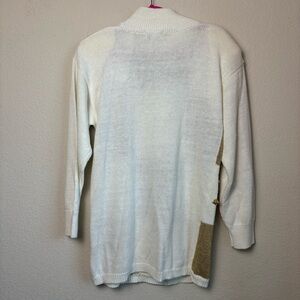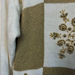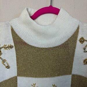 90s vintage sweater with gorgeous beaded detailing and metallic gold threading. Tunic length turtleneck. Has shoulder pads that can be easily removed. Perfect for a glam vintage holiday look!