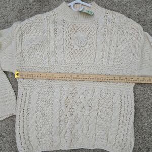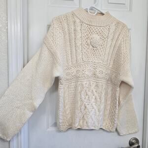 NWT Vintage Hand Knit Chunky Flower Cable Sweater L Cottage Boho Cream Grandma