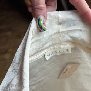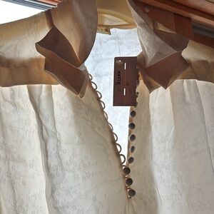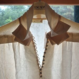 This shirt is so beautiful. They’re small little flowers on the silk and it’s extremely soft and in great condition there’s only one little brown or light stain in the back of the collar which almost looks like it’s inside the cloth or a shadow shown in picture. otherwise it is in perfect condition has extra buttonscan’t go wrong.