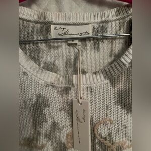 White and grey tie dye, summer shaker knit sweater. Two front hem splits. One-of-a-kind construction- no two sweaters alike. Sun & Sand written in cursive in tan. (BIN9)