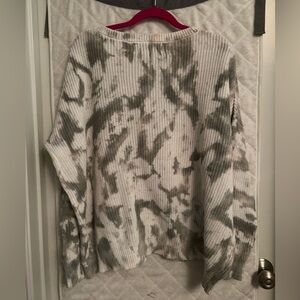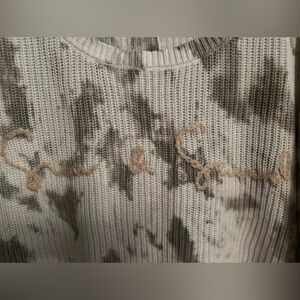 White and grey tie dye, summer shaker knit sweater. Two front hem splits. One-of-a-kind construction- no two sweaters alike. Sun & Sand written in cursive in tan. (BIN9)
