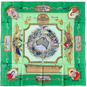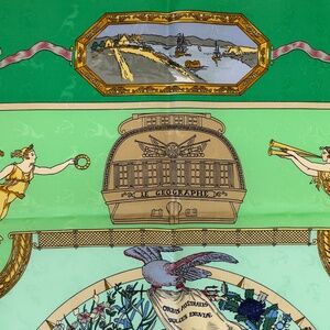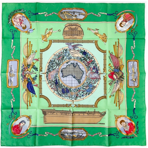 "The Geographer" is a depiction of French explorers to Australia. Designed by Sandra Laroche. 90cmx90cm (35"x35") made in France. 100% silk. *A box will be provided, but not an Hermès box for this one.