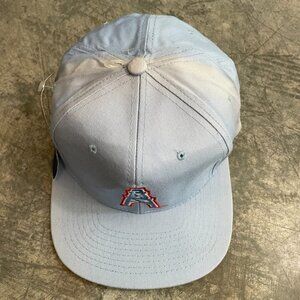 Such an amazing vintage hat by Drew Pearson! Houston Oilers embroidered logo on front. Classic baby light blue, red, white colors. Snapback. NFL official licensed product. 100% cotton. New vintage, unworn with tags attached; however, please note discoloration due to storage (see photos).
