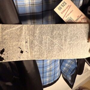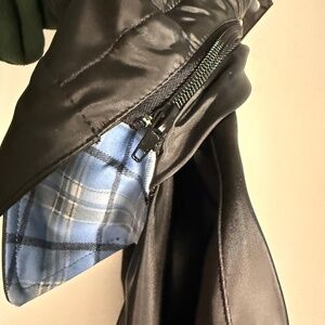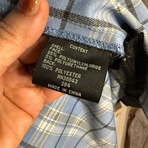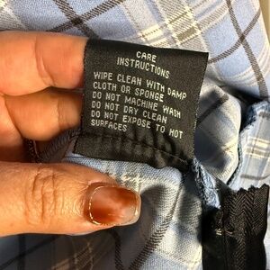 Not lined but patterned in light blue, navy and white plaid.