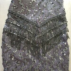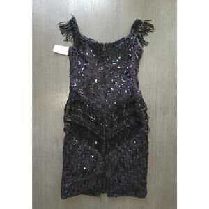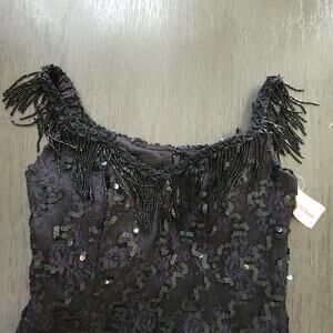 NWT vintage black cocktail dress. No tears, stains, or rips. It features a V-neckline, a fitted bodice with boning, sequins, and beaded fringe details. It is from the 80’s Julie Duroche for After Five collection Saks Fifth Avenue. This dress is adorned with sequins, a tiered fringe skirt, beaded fringe straps, gorgeous lace, and an intricately beaded neckline. It is a size 2P, please see measurements in pictures to ensure proper fit.