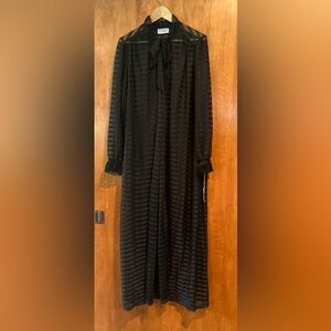 This gorgeous black robe is perfect for anyone who loves classic designer clothing. The gown features a striped pattern with a bow accent and long sleeves, while the robe is partially sheer and lightweight, making it ideal for summer, fall, or spring.