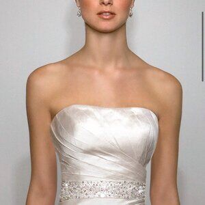 Step into a fairy tale with this vintage Martina Liana gown, crafted from luxurious 100% ivory silk that flows effortlessly with every step. The strapless, fitted bodice enhances your silhouette, while the princess train cascades behind you in a breathtaking display, adorned with sparkling gems along the hem. Elevate your bridal elegance with this timeless masterpiece that effortlessly blends classic romance with modern sophistication.
