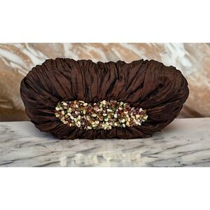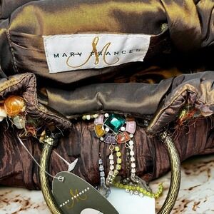 This new with tags vintage Mary Frances Enchanted Forest Handbag is a work of art! A unique Mary Frances bag featuring iridescent brown pleated silk fabric, engraved bronze handles and hardware, flowers, leaves and stone top trim, beaded bottom and a gemstone center decoration. Mary Frances bags are known for their whimsical themes, elegance, details and quality and this handbag has all of that and more. If you love or collect Mary Frances, then this is a must have for your collection!