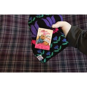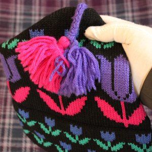 Very cute hat with lots of pretty purple and pink flowers woven into the design. The cap is new with original tags and is made of 100% virgin wool with a cotton liner to prevent itching. Indicates that one size fits all but also says it is for kids aged 4-12. These are from the 80s.