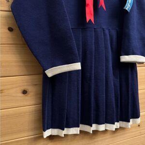 Navy Blue Long Sleeve Pleated Skirt Dress With Red Bow No Flaws Seen