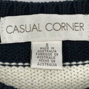 Made in Australia (guessing this dates to the 90s) in 100% cotton for Casual Corner features a large white intarsia star on front of navy field with white and navy stripes on back. Long sleeves in solid navy, slightly scoop neck, pullover style.