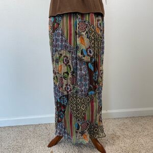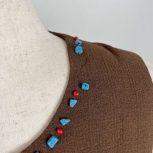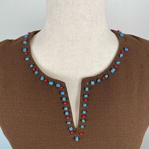 Super fun vintage maxi dress by Sherry Martin. And features of beaded design along the collar. Please note it is missing one or several beads but hopefully an easy fix. It measures 19 inches armpit to armpit lay flat and is 52 inches in length from the shoulder to the hem.
