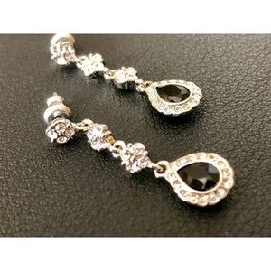 NWT Vintage Signed Monet Silver & Black Teardrop Crystal Trim Dangly Earrings