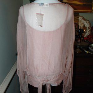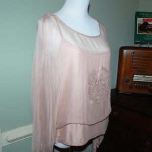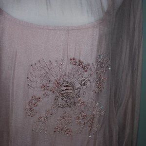 Muted rose color, with tags, Sheer layers, rayon fabric, raised embroidery on the bodice and sequins, ties at the lower waist in the back, over-blouse with camisole underneath