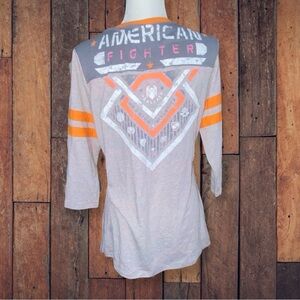 Embrace the bold aesthetics of the early 2000s with this vintage American Fighter graphic tee. Featuring a distinctive design with striking orange accents on the sleeves and a standout graphic on the front, this top is perfect for adding a touch of nostalgia to your wardrobe. Made from soft, comfortable fabric, it ensures a relaxed fit and all-day comfort. Whether you're revisiting a favorite era or just love retro fashion, this tee is an ideal choice for any casual occasion. Stand out with its unique style and timeless appeal!