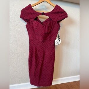 Get your wiggle on in this burgundy Sandy dress from Hell Bunny. The fitted pencil dress has an allover black polka dot print that will make you want to strut your stuff around town! Simplicity is key with a wiggle dress, so the details are minimal - a cutout, sweetheart neckline draws attention up, while the deep V back and lower back keyhole detail are unexpected, but welcome accents when you turn around. Back zipper closure. Dress does have some stretch.