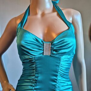 New with tags vintage 2000s (Y2K) Morgan & Co greenish blue/teal mini dress. Halter top, tie at back of neck. Ruching. Dress is new with tags but may have loose threads.