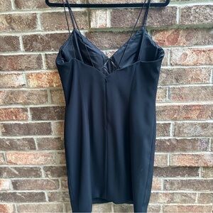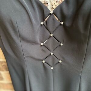 New with tags! Stunning vintage Y2K black cocktail dress featuring rhinestone lattice front detailing and rhinestone double spaghetti straps. Crafted from a mid-weight material with a slight stretch for a flattering, structured fit. Elegant and glamorous — perfect for cocktail parties, formal events, weddings, or a special night out. Original retail price $260.